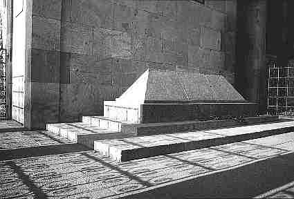 Unberührt blieb die Gruft mit dem Sarg bei der Erneuerung der Grabstätte im Jahre 1923/24 anläßlich der zweihundertsten Wiederkehr von Kants Geburtstag.46) Die baufällige neugotische Grabkapelle wurde auch infolge des veränderten Zeitgeschmacks nicht mehr für würdig befunden. Friedrich Lahrs (18801964), Professor für Architektur an der Königsberger Kunstakademie, der ab 1898 in Charlottenburg Hochbau studiert und bis 1908 in Berlin gearbeitet hatte, 1906 hatte er den Schinkel- Preis erhalten, schuf über der Gruft mit dem Metallsarg eine offene Ehrenhalle mit schlanken Porphyrpfeilern und flachem Kupferdach. Die Stelle, unter der die Gebeine Kants ruhen, nimmt seither ein granitener Kenotaph ein. Anders als der Dom blieb das Grabmal in den Bombennächten des Jahres 1944 und in den Kämpfen um die Festung Königsberg 1945 nahezu unversehrt. Ob jedoch die Gruft noch heute den doppelten Zinksarg mit den Gebeinen Kants (und den Dokumenten) birgt, muß offenbleiben. Nach Kriegsende und noch 1950 wurde zumindest der Kenotaph aufgebrochen und beraubt,47) dann aber von der sowjetischen Stadtverwaltung wiederhergestellt und unter Denkmalschutz gestellt. | ||