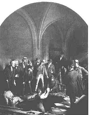 det war, entschloß man sich, auch Kants Gebeine zu bergen, um sie vor der gänzlichen Vernichtung zu bewahren. Vor Witterungseinflüssen geschützt und vor künftiger Verwechslung gesichert, sollten sie in einem Metallsarg in einer ausgemauerten Gruft wiederbestattet werden.1) Die Ausgrabung vom 22. bis 24. Juni 1880 führte der Maler Johannes Wilhelm Heydeck (18351910), Professor an der Kunstakademie, der als Mitglied der Altertumsgesellschaft Prussia zahlreiche prähistorische Gräber freigelegt hatte, eigenhändig aus. Er fertigte einen »Bericht über die Untersuchung der Grabstätte Kants ...«2) vom 25. August 1880 und hielt das Geschehen im Innern der Kapelle in einer Kreidezeichnung fest. Unsere Abbildung nach einer Reproduktion des verschollenen, zuletzt im Kant-Museum des Stadtgeschichtlichen Museums befindlichen Originals3) zeigt, wie Heydeck mit beiden Händen den Schädel Kants aus der von den Herren des Komitees umstandenen Grabgrube dem am Rande derselben knienden Kant-Forscher Emil Arnoldt (18281905) reicht.
