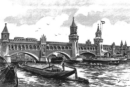 Die Oberbaumbrücke, mehrfach erneuert, blieb bis 1893 noch eine hölzerne Zugbrücke. Mit ihren 154 Metern Länge und bestehend aus 23 Jochen war sie die längste Brücke der Stadt.