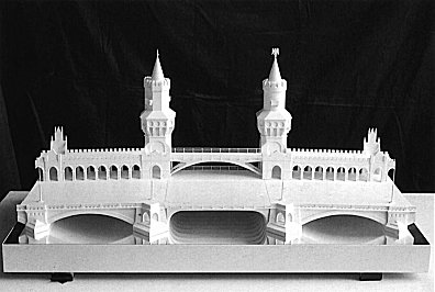 Brücke dadurch ausgebildet, daß neben der Mittelöffnung je ein acht Meter starker Pfeiler angeordnet ist, auf dem sich Warttürme im Charakter altmärkischer Stadttürme in Ziegeln auf Granitunterbauten ergeben, wie denn überhaupt die ganze Architektur den märkischen Backsteinstil zeigt«, heißt es in »Berlin und seine Bauten« von 1896. Wie die »Deutsche Bauzeitung« berichtete, fand die Schlußsteinfeier am 24. August 1895 bei strömendem Regen statt. 400 Personen waren gekommen, und jeder erhielt ein gefülltes Zigarrenetui mit der Inschrift »Schlußsteinfeier der Oberbaum- Brücke am 24. August 1895«. Und die »Berliner Illustrirte Zeitung« bezeichnete das Bauwerk