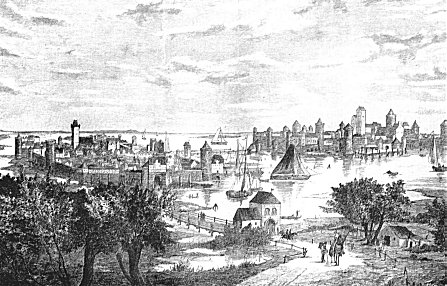 Berlin und Cölln um 1250, rechts Berlin mit Nikolaikirche, der Mühlendamm in der Mitte, links Cölln mit Petrikirche | |||