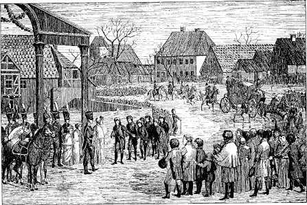 bewegte sich nun ein langer Zug durch die Straßen: Trompeter, denen 40 Postillione folgten, geführt von Königlichen Hof- Postsekretären mit gezogenen Degen. Hinter diesem Entree die Schlächterzunft in verschiedenfarbigen Uniformen mit Musik, dann eine Abteilung des berittenen Schützencorps, der Kommandierende der Parade mit dem Regiment Garde du Corps und schließlich der König selbst, hinter ihm die Prinzen und das Gefolge. Dann die Feldjäger und Stabs- Offiziere in Galauniformen, danach die Kutsche der Königin mit acht Pferden, begleitet von einer Eskorte des Schützencorps. Es folgten die Sechsspänner- Kutsche mit den Hofdamen der Königin, die bei der Parade vor dem Tor angetretenen Truppenteile und schließlich 49 Kompanien der Bürgergarde und die Angehörigen verschiedener Gewerke und Innungen wie Huf- und Waffenschmiede, Schiffbauer, Weber, Maurer, alle mit Fahnen und Insignien.