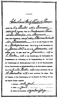 Christian Moritz Friedrich (genannt Friedo) Lampe wurde am 4. Dezember 1899 in Bremen als zweiter Sohn einer wohlhabenden Kaufmannsfamilie geboren. Aufgrund einer Gehbehinderung durch eine Knochentuberkulose wurde er im Ersten Weltkrieg lediglich zum »Heimatdienst« in einer Küchenverwaltung herangezogen. | ||