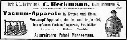 Aufstieg der Firma Heckmann und die Erfindung von Pistorius Schon im Jahre 1819 hatte Pistorius Bau und Vertrieb des Destillierapparates Carl Justus Heckmann übertragen. Gemeinsam mit Pistorius verbesserte Heckmann den Apparat und konnte dadurch die Alkoholausbeute weiter erhöhen. Dazu trug insbesondere bei, daß die Heizung der Destillationsapparate nicht mehr über offenem Feuer erfolgte, sondern vermittels Dampf mit Hilfe von Heizschlangen. Diese verbesserten Apparate fanden einen ständig größer werdenden Kundenkreis und erforderten den Übergang von der ursprünglich betriebenen Kupferschmiede- Werkstatt Heckmanns zum handwerklichen Kleinbetrieb. |